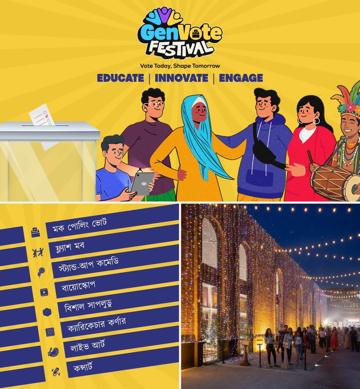 The GenVote Festival celebrates youth creativity, innovation, and civic engagement under the theme “Educate, Innovate, Engage!” On December 15th at Aloki, young people will come together for a full day of activities, performances, showcases, and interactive experiences that highlight the power of youth in shaping Bangladesh’s future. Please complete the registration form below to show your interest in attending. Registration does not guarantee entry. To increase your chance of receiving a festival pass, we encourage you to join the competitions available on the “Competitions” page.